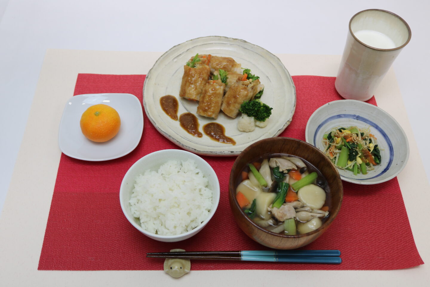 ・シャキシャキのみずななどの野菜を豚肉で巻いて焼いた三色肉巻きと、カロテンや鉄が豊富なこまつなのあえもの、果物はみかんを組み合わせました。