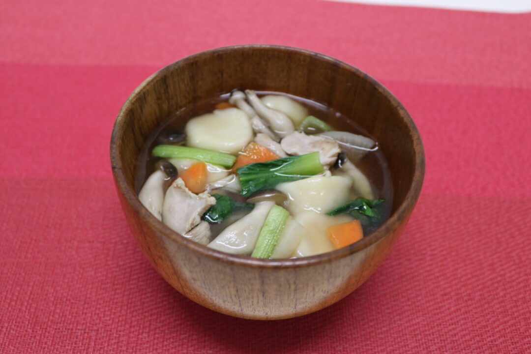 豆腐団子は、豆腐と白玉粉をこねて作ります。やわらかいもちもちとした食感の団子に仕上がります。豆腐には植物性たんぱく質やカルシウムが含まれ、丈夫な体づくりにつながります。だしのうま味のきいた温かい汁は、冷えた温めます。